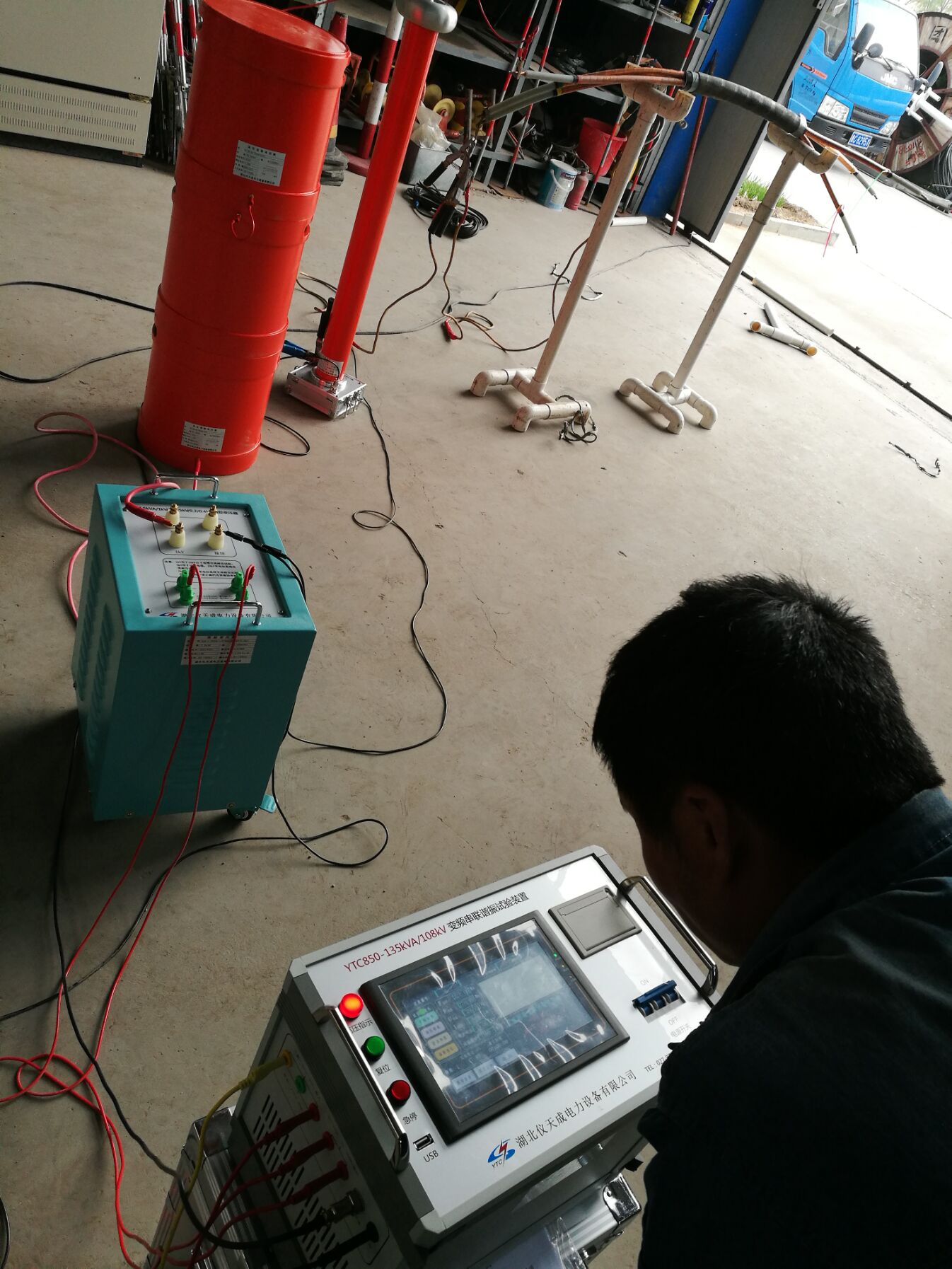 此次培訓(xùn)的設(shè)備和內(nèi)容很多。李工首先對(duì)各項(xiàng)設(shè)備的使用,接線方法進(jìn)行了實(shí)地操作和詳細(xì)的講解,但此次培訓(xùn)的重點(diǎn)是YTC850-135kVA/108kV變頻串聯(lián)諧振試驗(yàn)裝置,該設(shè)備具有流、零位啟動(dòng)、系統(tǒng)失諧(閃絡(luò))等保護(hù)功能,過壓過流保護(hù)值可以根據(jù)用戶需要整定,試品閃絡(luò)時(shí)閃絡(luò)保護(hù)動(dòng)作并能記下閃絡(luò)電壓值,以供試驗(yàn)分析。整個(gè)裝置單件重量很輕,便于現(xiàn)場使用。裝置具有三種工作模式:全自動(dòng)模式、手動(dòng)模式、自動(dòng)調(diào)諧手動(dòng)升壓模式,方便用戶根據(jù)現(xiàn)場情況靈活選擇,提高試驗(yàn)速度。