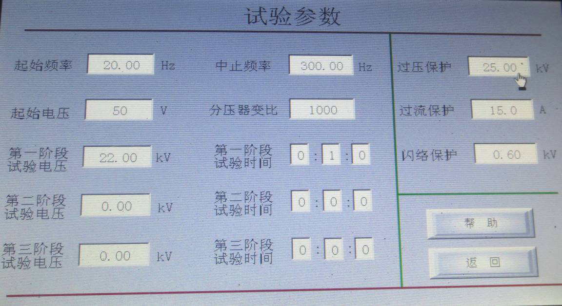 如果沒有階段性耐壓試驗時,只需設(shè)置一個階段試驗電壓值和相應(yīng)的試驗時間,其它階段試驗電壓和試驗時間設(shè)為0。