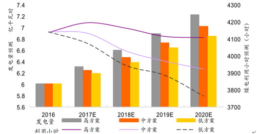 按照我國第十三個五年計劃的規(guī)劃,到2020年,我國的煤電的發(fā)電總量將會是11億千瓦,其占全社會的總發(fā)電量將進一步縮減4%左右,2017~2020發(fā)電量及發(fā)電小時預測如下圖: