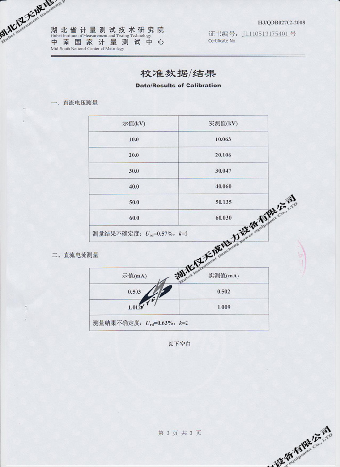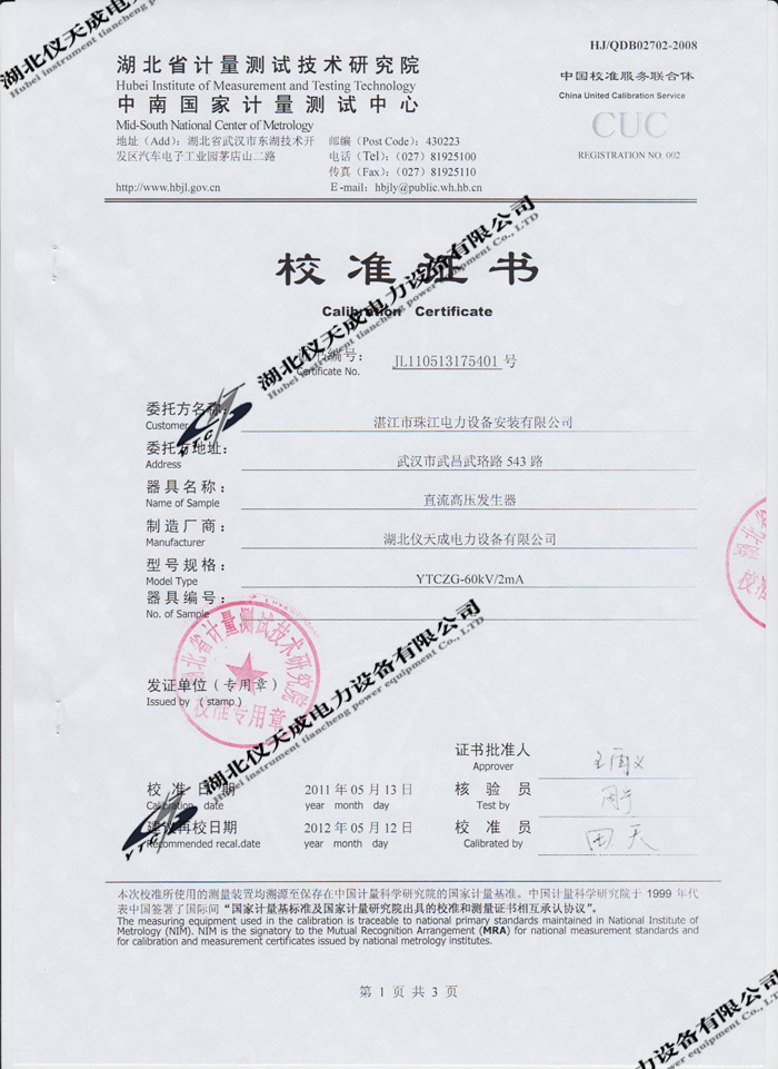 轉(zhuǎn)載:"YTCZG-60kV/2mA直流高壓發(fā)生器的資質(zhì)證書" 請(qǐng)注明來源于儀天成電力。 更多技術(shù)問題請(qǐng)致電儀天成電力客戶服務(wù):027-87876585,技術(shù)部專線:027-87876585,在線客服:719388481