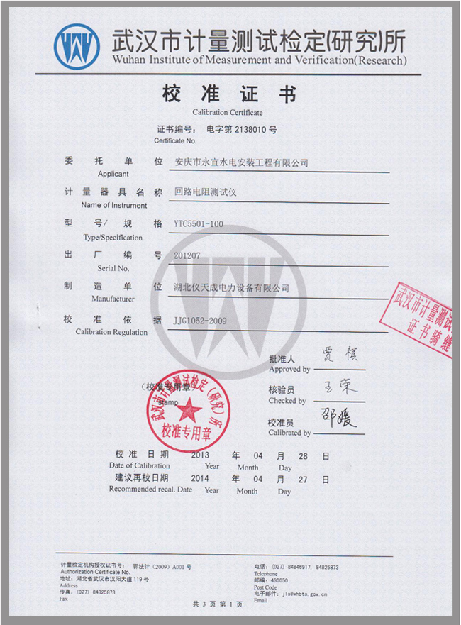 轉(zhuǎn)載:"YTC5501回路電阻測試儀鑒定證書" 請注明來源于儀天成電力。 更多技術問題請致電儀天成電力客戶服務:027-87876585,技術部專線:027-87876585,在線客服:719388481