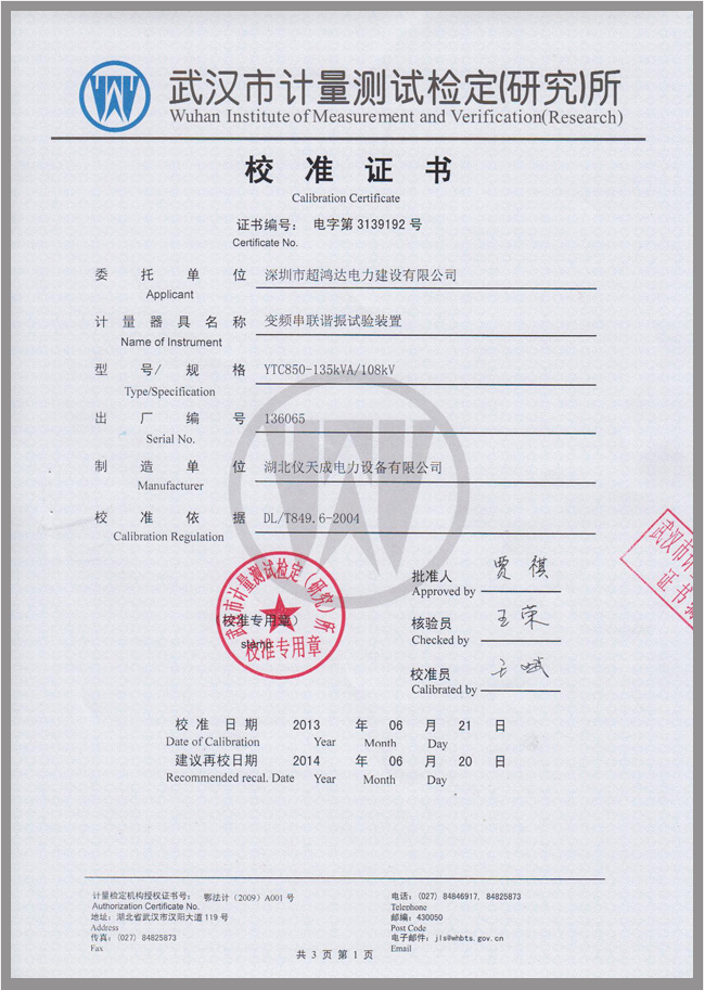 YTC850系列電纜交流耐壓試驗(yàn)裝置鑒定證書